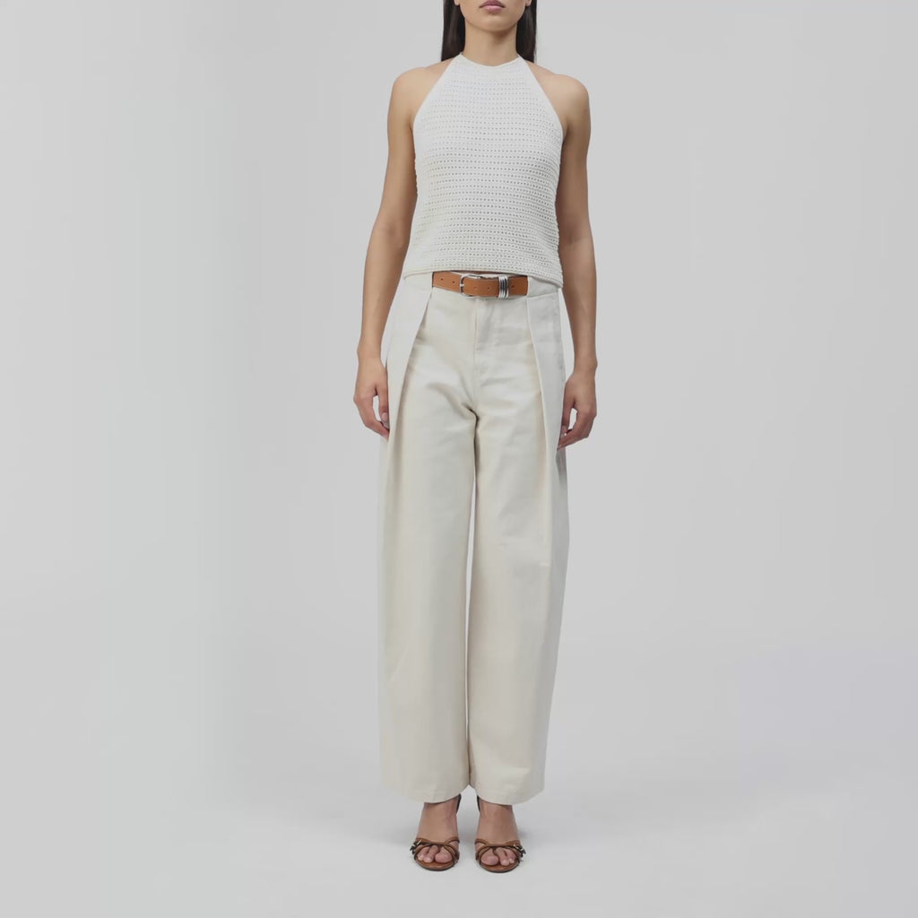 Schmal geschnittenes Neckholder-Top in Cropped-Länge mit markanter Strickstruktur. Die reine Baumwolle sorgt für eine sommerlich leichte Haptik und eine klare, gerade Silhouette.